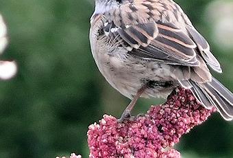 Zonotrichia capensis (Pichitanka) (Reptilia [ex Aves], Passeriformes). Ejemplar adulto sobre una inflorecencia de Quinua. Isla del Sol, Lago Titikaka, La Paz, Bolivia. Cámara Lumix FZ 50, zoom Leica 35 – 420. 29 de abril de 2007.