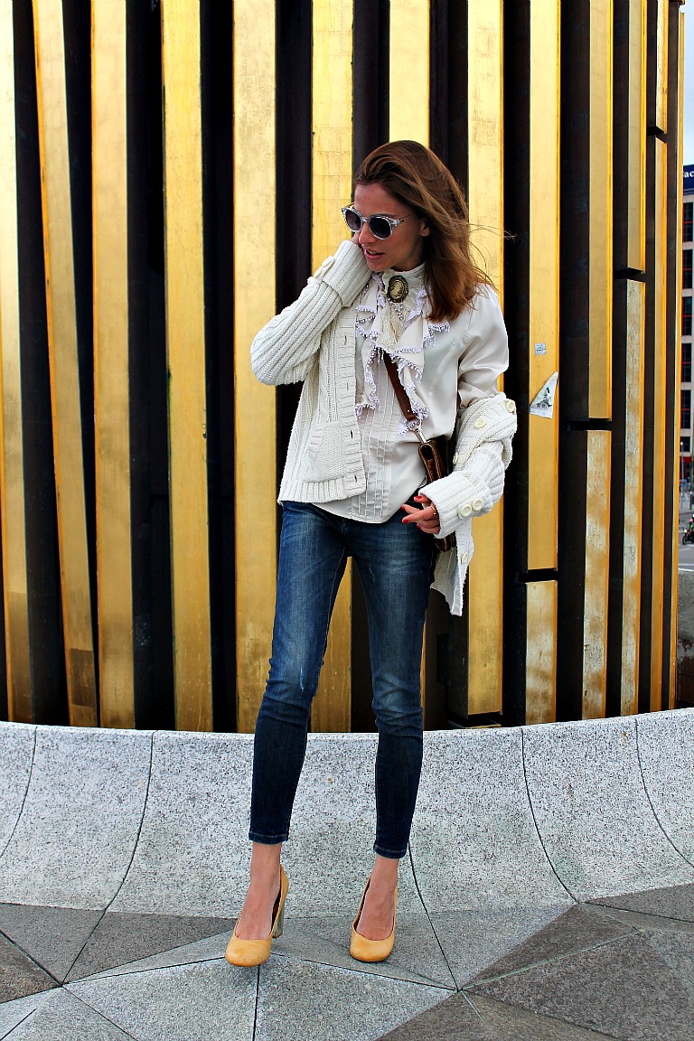 La camisa comprada en Portobello, es un regalo de mi amiga Cristina. El jersey, que tambien es de ella, le resta seriedad al look, y es que el día de las fotos aún hacía viento por Madrid.