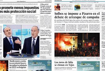 Recuerdo que cuando escribí este post ¿Austericidio? Manda tomates me cayeron insultos y términos como especulador, capitalista, troikista (este es nuevo)… etc. Pues aquellos como el economista José Carlos Diez, que pertenece a Intermoney, la cual fue la que mas expertos aportaba al gobierno de Zapatero, echaban pestes de la austeridad y que estaban advirtiendo de que los rescates están causando los destrozos de países, haber si os enteráis los que llamabais antipatriotas y eran la burla de muchos llevaban años avisando. Como es mejor una imagen a mil palabras yo os pongo las siguientes portadas del día después del debate entre Solbes y Pizarro, unos informan y otros ...