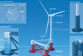 “Se trata del primer proyecto marino en el mundo que no ha requerido el empleo de equipos de cargas pesadas”, asegura Principle Power, que diseñó el sistema flotante. “Todo el ensamblaje final, la instalación y los trabajos previos a la puesta en marcha se han realizado en tierra dentro de un entorno controlado”, añade. Existen varios modelos de prototipos de aerogenerador flotante en marcha en Europa pero el proyecto de WindPlus es el primero que une las condiciones de una máquina multimegavatio montada en una estructura semisumergible, según Principle Power.