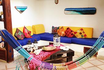 La posada Tropicana está justo al frente de esa laguna en el Gran Roque. De fachada blanca y quieta, tiene apenas cuatro habitaciones (dobles y triples) Es pequeña, pero cómoda. En la salita confluyen los colores y todas las conversaciones, mientras en la cocina se esmeran con algún buen plato. Y en el medio de la charla, un chinchorro, como para darle el toque hogareño. Me gustan las posadas que están llenas de detalles y aquí en Tropicana uno se puede distraer con el título de algún libro, el mapa de Los Roques colgado en una de sus paredes o en cualquiera de sus adornos. Sus dueños son dos italianos enamorados del azul del paisaje y le pusieron cariño para recibir a los huéspedes.