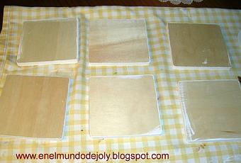 Les di cola, deje secar y después puse las servilletas con la técnica de la plancha...el resultado perfecto, un decoupage sin arrugas, en este caso el idóneo para los posavasos. Para rematar barniz al agua y listos para usarlos.