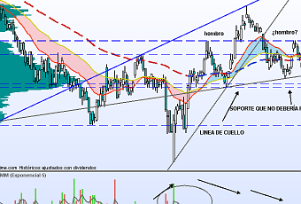 El Hombro, Cabeza, Hombro, estaría confirmado con la ruptura de la línea de cuello. El problema es que no nos podemos poner cortos, por tanto va a ser difícil aprovecharnos de este movimiento. ¿Alguien se estará aprovechando? Yo no lo dudo.