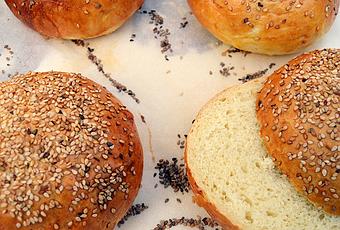 Somos mucho de comer pan, demasiado. Personalmente no tengo queja del que trae el panadero, pero de vez en cuando gusta hacer el tuyo propio, por cambiar y por experimentar. Hacer pan da gustico, mezclar los ingredientes con las manos, tocarlo, amasarlo, ver como la masa se transforma al fermentar...y encima, cuando le coges el punto y te salen panes espectaculares y fotogénicos te hinchas de orgullo y te dedicas a enseñárselos a todo el mundo. Después de hacer muchos panes, supongo que lo más importante a tener en cuenta para que sea lo más decente posible son la humedad y la paciencia. La paciencia a sido lo que he llevado peor, porque quería pan y lo quería ya. Así que cuando empecé no respetaba los tiempos de fermentación (y ahora todavía me cuesta) y os podéis imaginar los churros que me salían, comestibles si, pero se los comía el perro. La humedad es otra, al principio la masa se pega en las manos y es frustante. Tu estás ahí, con tu imagen mental del panadero amasando una masa fina y elástica, que no se pega nada; mientras, tienes un engrudo pegajoso entres las manos con una pinta terrible. Supera la tentación y NO añadas más harina, déjala, sé paciente, cuando repose y empiece a fermentar cambiará, te lo prometo.Deja reposar la masa tapada con film, o en un tupper grande, con tapadera, para conservar la máxima humedad. Y por último, la humedad en el horno: pon un cacharro con agua dentro, incluso cuando vayas a meter los panes, tira un vaso de agua en el suelo del horno (con cuidadito de no quemarte con el vapor), así evitarás que la superficie del pan se seque y endurezca antes de tiempo, creando una costra que impida al pan crecer y cocerse correctamente.Para este tipo de pan, un último consejo: al sacarlo del horno mételo en una bolsa de plástico, para que la superficie se ablande y queden bollitos blanditos de hamburguesa. Si no los vais a consumir en el día, mejor filmarlos uno a uno, protegerlos bien con una bolsa y congelarlos en cuanto se enfríen. Esperamos que os gusten.