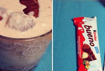 Para llegar al cima del placer, los choco-viciosos necesitaremos un vaso de leche y 3 barquillos de Kinder Bueno, a los cuales batiremos muy bien con la picadora, o bien batidora. Decoraremos con otro barquillo y nos pondremos finísimos aka hasta las cejas con la dicha guarrindongada.