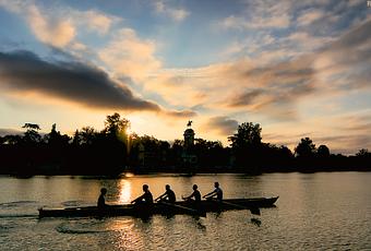 En esta ocasión comparto con vosotros un momento que irradia tanta belleza como tranquilidad. Las primeras luces del día visten de dorado el estanque de un parque del Retiro que todavía duerme y que muestra su lado más iintrovertido. Entre sombras, un grupo de remeros, más madrugadores incluso que el propio sol, avanzan en su embarcación sin oposición ni obstáculo alguno. No hay barcas kamikazes ni músicos callejeros ni bullicios incómodos. Tan sólo ellos y un estirado Alfonso XII que desde su altísimo pedestal parece agradecer la tempranera compañía. Casi se puede palpar el silencio, sólo roto por las batidas de los remos contra el agua.