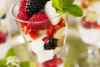 En una procesadora o mixer mezcla las fresas, los arándanos y las frambuesas (que no queden líquidos sino apenas como pasta o puré) no sin antes apartar algunos (los más sanos y lindos) para decorar.Bate las yemas y el huevo junto con el azúcar; cuando la preparación esté prácticamente blanca y con textura de crema, suma los frutos procesados en el paso anterior y el licor.El último paso es incorporar muy despacio y con movimientos envolventes la nata apenas batida sobre un bol con hielo debajo; la idea es sostener el frío al batir para evitar que ésta suba.Se sirve en copas decorando con los frutos que reservaste, los trocitos de durazno en almíbar y algunas hojas de menta.Fuente: cocina