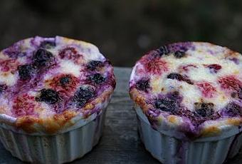 2.Ponga las frutas del bosque en 6 moldes pequeños (que se puedan introducir al horno), acomode las frutas dejando algunos espacios pequeños entre las frutas para que la crema pueda esparcirse por todo el molde.