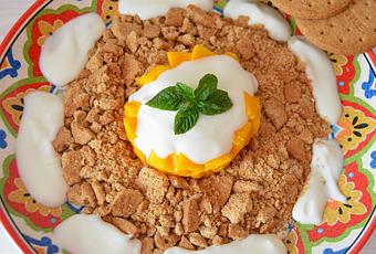 INGREDIENTES:- 6 galletas de fibra.- 1 mango.- 1 yogurt cremoso 0% de grasa.- Hierbabuena. PREPARACIÓN:Machacamos las galletas en un mortero, pero sin que llegue a ser polvo, tiene que tener trocitos como veis en las fotos, ponemos las galletas por todo alrededor del plato donde vayamos a servir.Pelamos el mango y lo cortamos en trocitos, ponemos un aro para emplatar en medio del plato y dentro ponemos el mango, presionamos un poco y quitamos el aro.Solo nos queda poner el yogurt por encima, decorar con unas hojas de hierbabuena, coger la cuchara y lanzarse a por el plato ummmm......