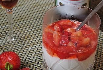 Ingredientes: 14 fresas; 1 copita vermú rojo italiano; 1/2 cucharadita esencia de vainilla; ralladura naranja; 2 cucharadas azúcar; 10 cucharadas yogur griego.
