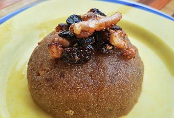 - Bajamos el fuego y incorporamos poco a poco el agua caliente sin dejar de remover. Subimos el fuego y cocinamos hasta que el agua se reduzca por completo. Añadimos el cardamomo y el azúcar, dejamos cocinar removiendo de vez en cuando hasta que se disuelva el azúcar y la mezcla obtenga un consistencia semisólida. Añadimos las almendras, las nueces y las pasas, mezclamos y servimos. Decoramos con frutos secos.