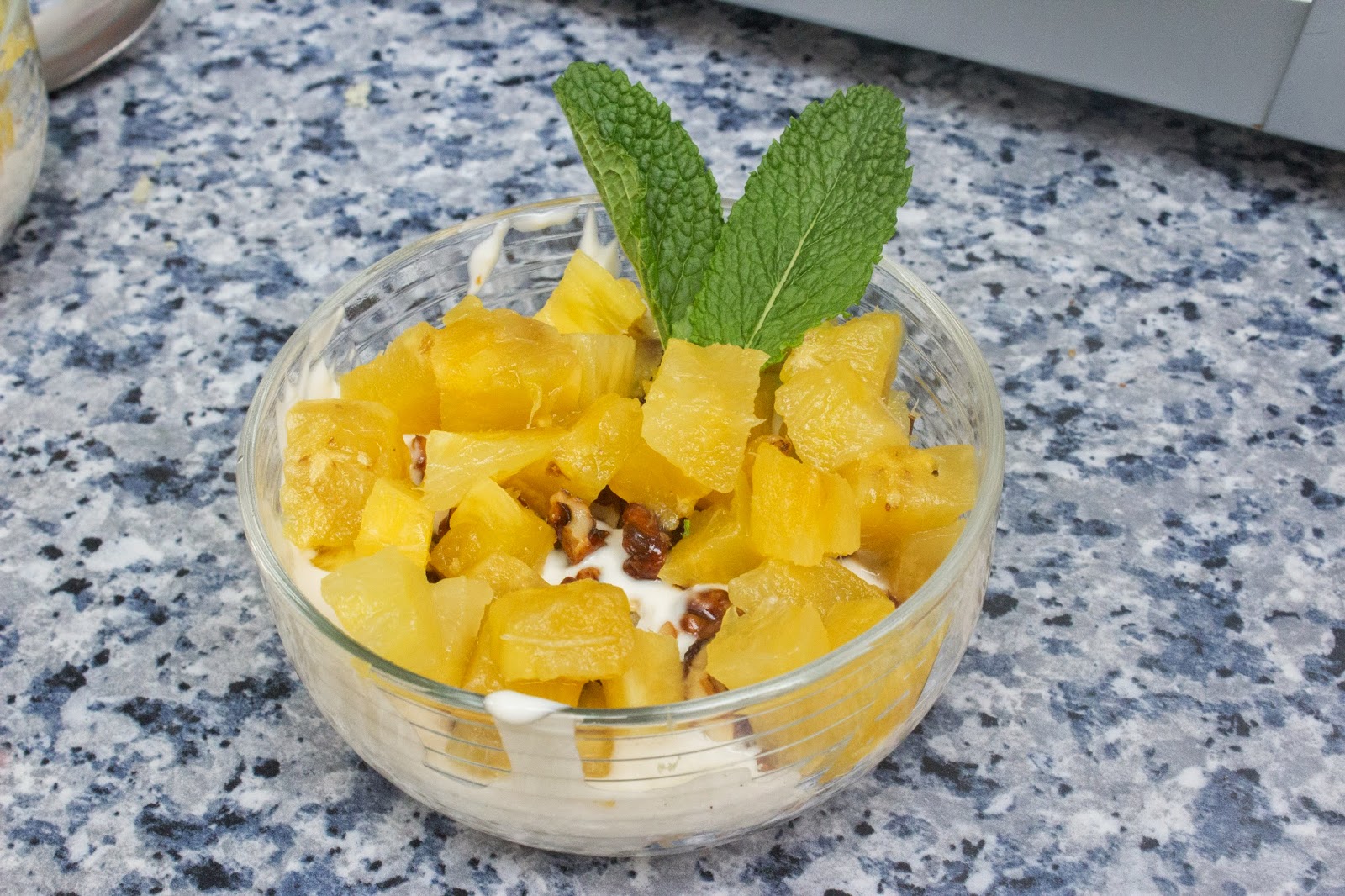 Hoy traigo un delicioso postre de piña y yogur con hierbabuena. Es un postre rápido, sencillo y que es una merienda ideal para la familia.