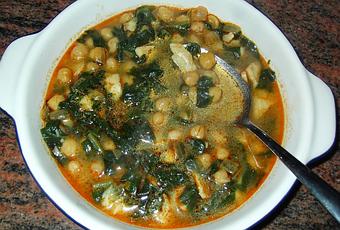 Ingredientes:- 200 gramos de garbanzos.- 150 gramos de espinacas.- 100 gramos de bacalao.- 1 hoja de laurel.- 2 dientes de ajo.- Media cebolla.- 1 cucharadita de postre de pimentón dulce.- 2 cucharadas soperas de aceite de oliva virgen extra.- 1 cucharada soperas de harina.- Sal.