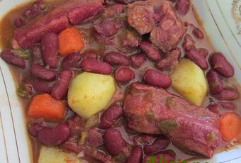 - Alubias rojas 500 g.- Costilla ibérica adobada 350 g.- Tomate 1.- Pimiento verde 1.- Cebolla 1.- Zanahoria 1.- Patatas 2.- Aceite de oliva 3 cdas.- Sal.