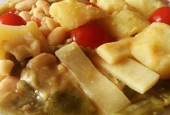 - 300 gr. de alubias blancas. -200 gr. judías verdes. - 200 tallos de bambú . - 2 tomates maduros. - Una cebolla mediana. - 3 dientes de ajos. -Un pimiento rojo. -1 patata. -Sal. -Aceite de oliva. Elaboración: - Sofreímos el tomate, la cebolla y el ajo bien picados . - Añadimos los trocitos de pimiento rojo,las judías verdes y la patata.