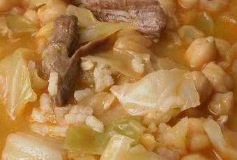 250 gr. de garbanzos remojados (echar los garbanzos la noche anterior para reblandecerlos en agua con un puñado de sal), una zanahoria cortada en trozos pequeños, una patata cortada en cascos, un trozo de ternera (uso de jarrete), un muslo de pollo, un hueso fresco de ternera (tuétano a ser posible), un trozo de tocino fresco, un hueso añejo, un trozo de manteca salada, un trozo de tocino añejo, un trozo de “pellejo” añejo, media col cortada en trozos pequeños, media taza de arroz de grano redondo y agua.
