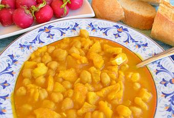 Introducimos los garbanzos y el bacalao desmenuzado, el pimentón y el colorante, añadimos agua hasta que los garbanzos estén cubiertos, mezclamos bien y dejamos a fuego unos 15 o 20 minutos.