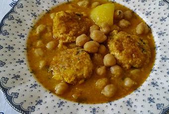 En la olla ponemos un chorrito de aceite y se sofríe la cebolla rallada, cuando está a medio freír añadimos el tomate rallado. Cuando el sofrito está hecho añadimos los garbanzos y las patatas peladas y cortadas en trocitos pequeños, cubrimos de agua, añadimos un poco de sal y cerramos la olla y dejamos cocer durante 10 minutos contando a partir de que sube la válvula (si cocemos en olla normal ponemos más agua y cocemos unos 45 minutos).Cuando podamos abrir la olla, añadimos las albóndigas, un majado con el ajo, perejil, azafrán de pelo y el huevo duro, probamos de sal y sin cerrar la olla cocemos a fuego lento durante 5/10 minutos más.