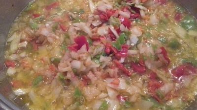 Pon a calentar aceite en una sartén, sofríe la cebolla picada. Cuando se ponga transparente añade los pimientos picados.