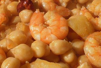 Dejar toda una noche los garbanzos en remojo en agua con un puñadito de sal.Pelar los langostinos, reservar la carne. Hacer en una olla un fondo de pescado; para ello en una cacerola poner el pescado llevar a ebullición y espumerear, dejándolo cocer unos quince o veinte minutos (yo he usado la cabeza, la cola de una merluza y la cabeza y la piel de los langostinos), colarlo bien y reservar. En una cacerolita echar un chorreoncito de aceite de oliva virgen extra (malagueño a ser posible, en ésta ocasión como hacía mi madre, he usado aceite de Periana). Picar una cebolla pequeña, blanca en trozos muy pequeños y pocharla en la cacerolita a fuego lento salándola previamente, con cuidado de que no se queme. Escurrir y enjuagar los garbanzos, incorporarlos a la cacerola y echar el caldo de pescado, hasta la mediación de la cacerola, dejándolos cocer a fuego medio durante unos tres cuartos de hora aproximadamente. Si fuese necesario añadir más caldo, que esté caliente. Picar cuatro o cinco dientes de ajo en trozos pequeños. Echar en una sartén un cucharon de aceite y sofreír los ajos y los langostinos (cuidando mucho que los ajos no se quemen) durante unos minutos. Apartar del fuego y agregar una cucharada de pimiento molido (pimentón). Cortar una patata a cascos (trozos irregulares que casi se arrancan de la patata) y agregarlos a los garbanzos, pasado unos minutos añadir el refrito de ajos y langostinos (el PIL PIL como llamamos los malagueños a éste plato tan popular ) y dejarlo cocer hasta que las patatas estén tiernas.
