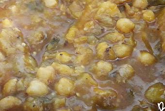 INGREDIENTES:1 berenjena250 gr de pulpa de calabaza600 gr de garbanzos cocidos1 cebolla1 zanahoria1 litro de caldo de verdura2 cucharadas de tomate frito1 cucharadita de pimentónCominoAceiteSalELABORACIÓN: