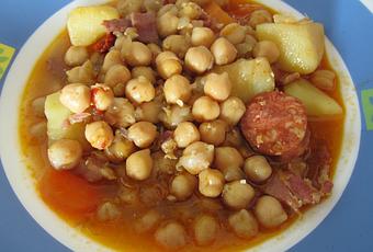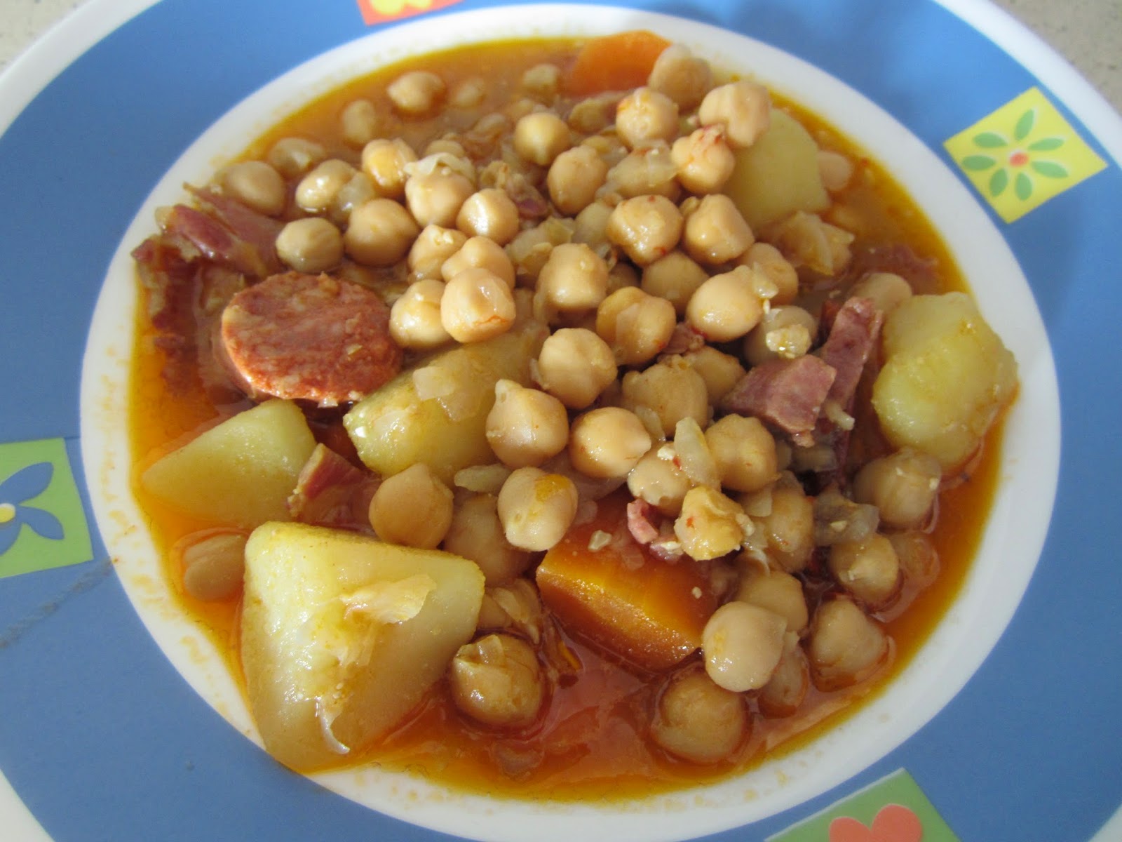 INGREDIENTES:- Un bote de garbanzos cocidos.- Una patata grande.- Una zanahoria grande.- Media cebolla.- Un chorizo.- Taquitos de jamón.- Calabaza troceada.- Pimiento choricero.- Pimentón Dulce.- Aceite.- Picada Catalana (Colines, almendras, avellanas y piñones)