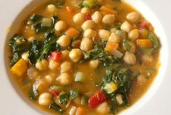 - 1 Kg aproximado de garbanzos cocidos ( 2 potes grandes de cristal si los compráis cocidos)- 1 puerro - 1 zanahoria grande- 3 dientes de ajo- 100 gr. de kale, espinacas o acelgas- 1/2 pimiento rojo- 1/2 pimiento verde- 1 calabacín pequeño- 150 gr. de calabaza- 4 tomates rojos- Sal- Caldo de verduras o agua con un cubito de verduras- Aceite
