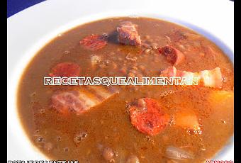 INGREDIENTES400 gr. de lentejas pardinas, una cebolla 2 zanahorias, un tomate maduro, una patata mediana, una cabeza de ajos, un trozo de tocino de cerdo de 100 gr., un trozo de jamón de 100 gr. un chorizo, una morcilla (opcional), 50 ml. de aceite de oliva, dos cucharillas de pimentón dulce, 3 clavos de olor, una hoja de laurel, 3 granos de pimienta negra.PREPARACIÓN El Potaje de Lentejas, es plato importante en la Cocina Tradicional Española, y no demasiado complejo en su elaboración. Cogemos una olla de las dimensiones adecuadas para todos los ingredientes (hay que tener en cuenta que las lentejas aumentan su volumen considerablemente), e incorporamos las lentejas previamente lavadas y escurridas, los embutidos (preferiblemente enteros y los cortamos antes de servir), la zanahoria en rodajas, la patata y el tomate en dados grandes, la cebolla cortada en cuatro trozos, al que le clavamos un clavo de olor a cada uno de los trozos de cebolla, esto permite retirarlos al final. Añadimos además, el pimentón dulce, la hoja de laurel, la pimienta negra y una pizca de sal. Finalmente sumamos a todo esto la cabeza de ajos entera, dos litros de agua y 50 ml. de aceite de oliva. Ponemos al fuego y dejamos cocer tapado durante 90 minutos a fuego lento. removemos un poco al principio de la cocción. Cortamos los embutidos en trozos en el momento de servir.Servimos bien caliente en una sopera. Salud.
