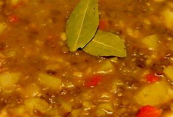 - En una olla grande, echar las lentejas junto con 3 vasos de agua tibia, 3 cucharadas de aceite, un poco de sal y el laurel.