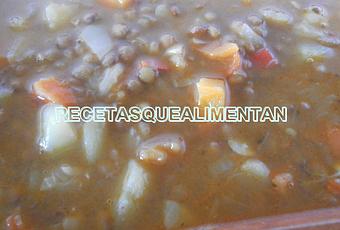 Añadimos las lentejas, el pimentón dulce y el agua en cantidad suficiente (dos dedos de agua por encima de los ingredientes).