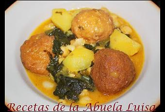 - La noche de antes ponemos en remojo los garbanzos y las alubias (por separado). - En la olla exprés ponemos los garbanzos, con un poco de sal, cubiertos con agua 2-3 dedos por encima, dejamos cocer ½ hora desde que empiece a salir el vapor, apagamos, dejamos enfriar para abrir la olla, incorporamos las judías con otro poquito de sal, dejamos cocer otros 30 minutos, apagamos el fuego y dejamos enfriar para abrir la olla. - Entretanto vamos haciendo los rellenos: Batimos bien los huevos, les añadimos el pan rallado, mezclamos bien, incorporamos el ajo y perejil picados junto con la pizca de sal, volvemos a mezclar bien. Con una cuchara vamos echando bolitas en aceite de girasol bien caliente, dejamos dorar, retiramos sobre papel de cocina absorbente, reservamos.