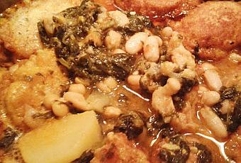 Ingredientes para unas 6 personas: 200 grs de judías blancas; 200 grs de garbanzos; 2 paquetes de espinacas frescas; 1 lomo de bacalao en salazón; 4 dientes de ajo; 1 cebolla; 1 pimiento verde; 1 bote de tomate natural triturado; cominos molidos; 1 cucharada de pimentón; 2 hojas de laurel; 1 cucharada de harina; 4 patatas medianas;perejil fresco.