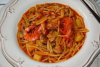 Añadimos 1 litro de agua, las patatas cortadas en cuadraditos, el diente de ajo frito y machacado, el azafrán, perejil, los fideos, las gambas y las almejas con su caldo.