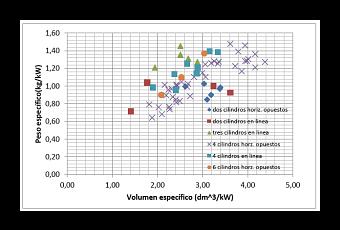 En la fig. 1 se muestra el gráfico obtenido utilizando como parámetro el nº de cilindros y su configuración. Puede verse que los “4 cilindros horizontales opuestos”, los más abundantes, ocupan una banda diagonal creciente. Se observa que, para el mismo volumen específico, los motores con los cilindros en línea presentan un mayor peso específico.