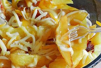 Cuando las patatas estén listas dejamos escurrir el exceso de aceite en papel absorbente Colocamos en el recipiente donde las vayamos a servir y enseguida añadir el queso rallado sobre las patatas para que se funda con el calorcito. Remover un poco si queréis para que el queso llegue a todas partes.