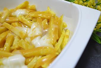 Pelar y cortar las patatas en bastones y freír en abundante aceite muy caliente. Una vez fritas sacar a una fuente con papel de cocina para quitar el exceso de aceite. Colocar en la fuente para servir, poner unas cuantas cucharaditas de queso repartido por todas las patatas, calentar la salsa (muy caliente) verter por encima y servir al momento.