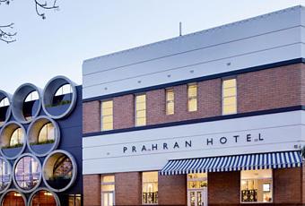 Este increible Pub está en el Hotel Prahran, en Melbourne. De aire industrial y con un patio como eje central del espacio. Este espacio cuenta con varios ambientes muy diferentes y en dos alturas, ambientes en los que se consigue más intimidad gracias a estos tubos de hormigón forrados de madera y a la vez las enormes cristaleras que le dan mucha luz y amplitud a todo el Pub.