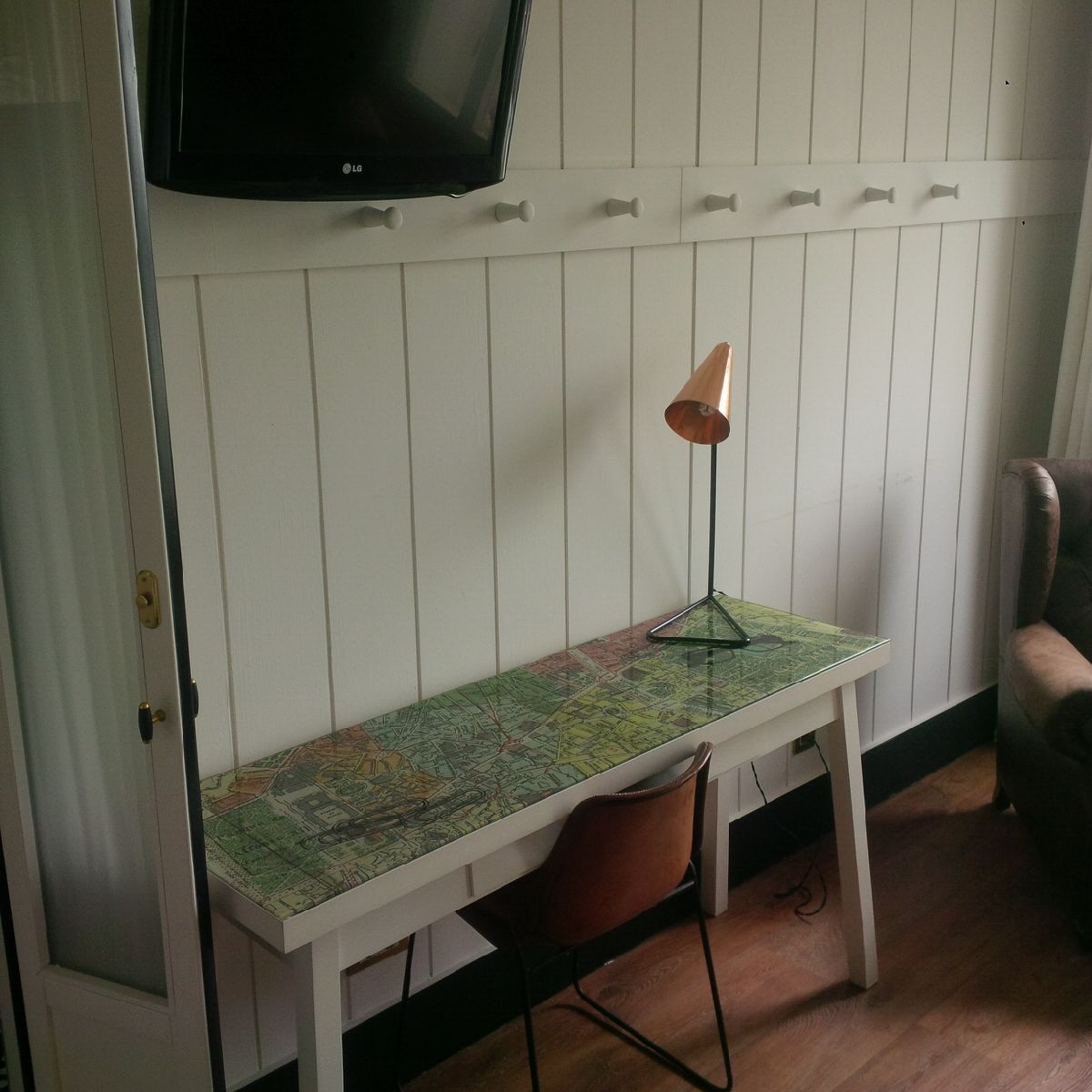 A continuación del armario hay dos estrechas puertas de color negro con cristales tapados por unos visillos en color crudo que dan acceso al baño. Junto a ello, una estrecha y larga mesa de trabajo casi de plástico decorada con un dibujo de un plano de Madrid. Sobre ella hay un antiguo flexo de cobre. Algunos papeles del hotel sobre ella, y un par de enchufes debajo. Delante, una silla no demasiado cómoda para trabajar. Sobre el conjunto, cuelga de la pared una moderna televisión plana. Antes de la pared del fondo, donde hay dos generosos balcones (aunque de terraza estrecha) con bonitas vistas al centro de Madrid, se sitúan dos enormes sofás orejeros de piel marrón antigua con una mesa redonda de centro que usamos de maletero.