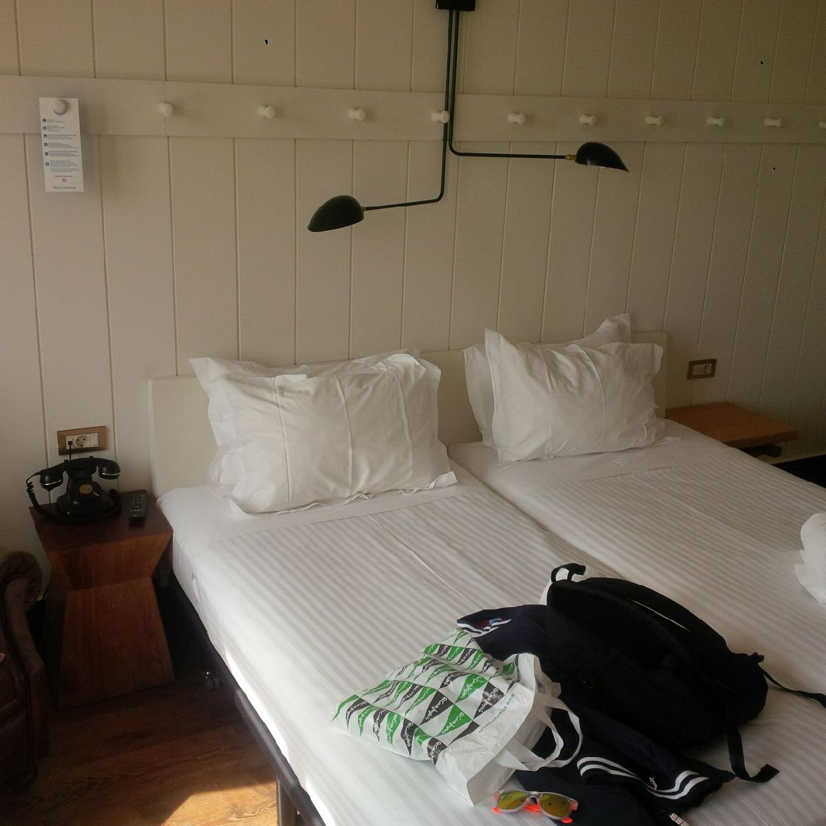 Dos camas blancas. Con sábana y colcha. Colchón cómodo pero sin más. Sábanas algo duras. Sobre cada cama un par de almohadas de distintos tamaños, durezas y grosores; y una toalla enrollada con un cartel de esos que fomentan la culpa en uno mismo por querer sábanas limpias. Por encima de las camas y ancladas a la pared hay cuatro enormes lámparas, metálicas en negro, situadas a distinta altura. Las altas iluminan la estancia. Las bajas sirve como lectura. Luz potente. A cada lado de las camas hay sendas mesillas modernas de madera. Sobre una de ellas, un teléfono. Y junto a ellas, interruptores para las luces y un enchufe.