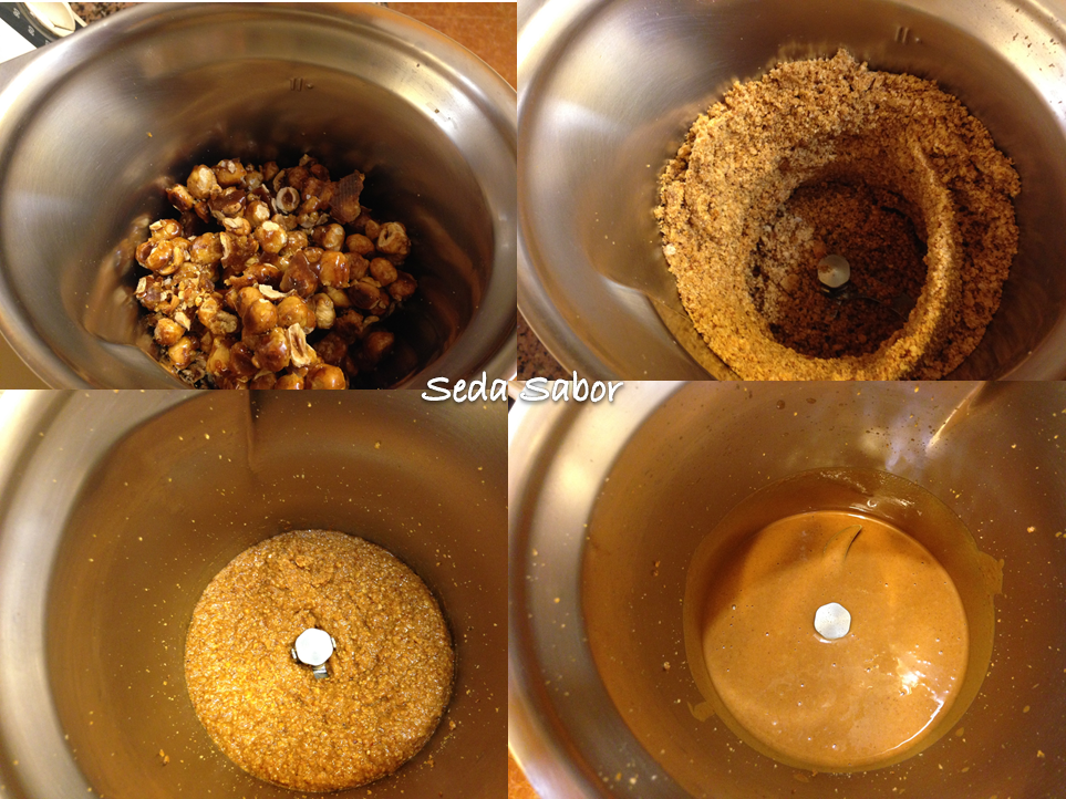 Partir en trozos esta especie de "guirlache" e introducir en el robot de cocina. Triturar a máxima velocidad hasta obtener una pasta lo más fina posible. Según se vaya triturando, saldrán los aceites de la avellana y se irá formando una pasta semi líquida. Si tenéis thermomix, una vez hayamos conseguido el triturado bien fino, programad dos minutos a 40º. y a velocidad 4.Volcar sobre un tarro de cristal esterilizado, enfriar y tapar.