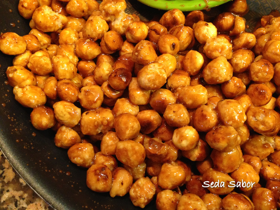 Llegará un momento en que el azúcar se empalice, formando una costra alrededor de las avellanas. En este punto, separar la mitad y reservar.