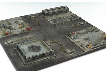 Para Adeptus Titanicus, tenemos el Civitas District War Zone Alpha por 100 euros. es una placa cuadrangular de 60 cm x 60 cm (2' son casi 61 cm) que tiene un cruce de carreteras con barricadas, trincheras y algunas edificaciones en las esquinas (Un Generatorum, unas oficinas del Administratum,..), con espacio de sobra para mover por ella hasta los titanes más grandes. Se puede combinar con otras piezas para hacer un tablero más grande y con la escenografía de plástico de la Civitas Imperialis que ya esta a la venta. "Que piezas" preguntáis. "Las que están por venir más adelante" nos responden.