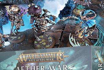 Aether War/Guerra en el Aeter: 145 euros. La caja además de las figuras para dos bandos (Kharadron y Tzeentch) incluidas las dos exclusivas contiene contadores, el reglamento básico de juego, cartas y el libreto de escenarios.