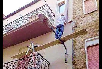 ¿Veis esa foto? Pues si el anclaje de esa farola cede y ese insensato se parte la crisma, el arquitecto o el aparejador (o ambos) pueden acabar en la cárcel.