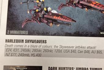 Y seguimos con W40K y con nuevas confirmaciones.Esta es la confirmación mas esperada de todas.Desde Faeit212 tenemos el precio de las nuevas Skywaevers y cuantas vienen.se confirman que viene dos por caja y por un precio de 31 euros.El resto de lanzamientos,al parecer son lanzamientos de Black Library que ya han sido comentados en entradas pasadas(Y sin necesidad de filtraciones)