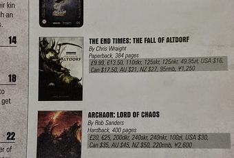 Desde El Taller de Yila tenemos confirmación de lo ultimo que quedaba por ver.Ha tardado un poco mas de la cuenta comparado con otras ocasiones,pero ya tenemos los precios y la lista de lanzamientos para este fin de semana.Con ya se sabía solo salen el nuevo Bufón de la Muerte y el Vidente de Sombras,al precio que yo me sospechaba(21 euros,como el Solitario).Era de esperar y cualquier otro precio que bajase de eso hubiera sido una autentica sorpresa.Supongo que luego el resto del lanzamiento serán packs webs y similares,pero no eso no sale en la WDW,solo en la web.La parte de BL,al menos de libros esta dedicada a WFB y al Fin de los Tiempos,como era de esperar,aunque solo un libro es nuevo,los demás son re-lanzamientos o nuevos formatos.Sobre todo era de esperar porque,como podéis ver mas abajo,se confirma que lo siguiente que viene es WFB El Fin de los Tiempos,bien aderezado de Khorne.