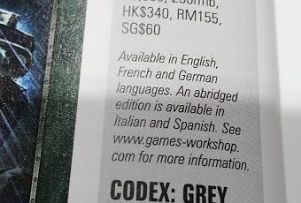 "Codex: Grey KnightsTapa dura en ambas ediciones, cambia el número de páginas por el "capado" (Se refiere al hecho de que el español, y el italiano, les faltan paginas de trasfondo, por ejemplo, que si tiene el inglés)En inglés 104 páginas a 32,50€En español 64 páginas a 25€