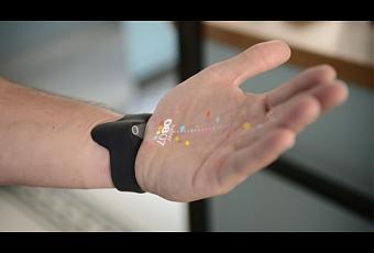 Por otro lado, el sistema consta de un pequeño proyector con sensor de movimiento que proyecta la información por ej. en una pared y podemos acceder a esa información al mejor estilo Tom Cruise en Minority Report. Además posee un pequeño reloj de pulsera que también proyectar la información que genera en la palma de la mano.