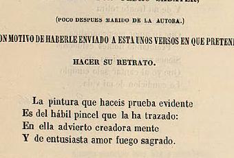 D. Pedro Sabater se enamoró perdidamente (como tantos otros), de la poetisa. Pero él fue mucho más allá. Aun conociendo las desgracias personales por las que atravesaba la escritora (deshecha relación con Tassara, nacimiento, enfermedad y muerte de Brenilde), le escribió unos versos en los cuales le pedía directamente su mano en casamiento. Y lo hacía en cuatro redondillas que formaban 16 versos octosílabos de arte menor y rima consonante. Este documento (el original) se encuentra localizado en la librería Miguel Miranda, AILA ILAB, cita en la calle Lope de Vega 19 de Madrid. El manuscrito, una joya de la literatura, está a la venta por el módico precio de 1.800,00 € en la citada librería (por si alguien está interesado).