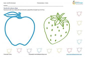 - Reconoce el color rojo. Colorea de rojo la manzana y pega bolitas de papel rojo en la fresa.